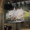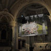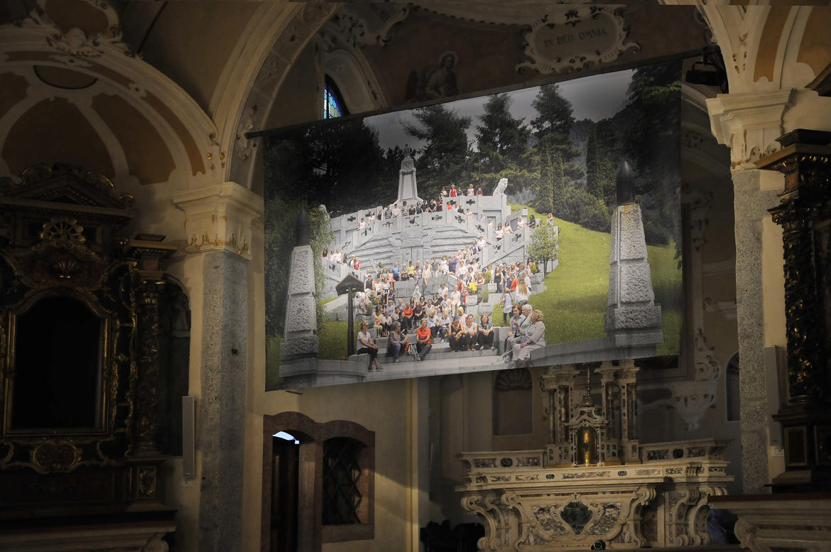 L’affollata performance che l’artista trentino ha immortalato in opere video e fotografiche dialoga ora con gli spazi dell'antico luogo di culto, che conserva un indelebile sapore di sacro. L'altare sembra proseguire idealmente verso l'alto, distendersi e allungarsi in una monumentale scalinata che accoglie un gruppo di donne assorte, mentre una proiezione evoca il momento del raduno.
