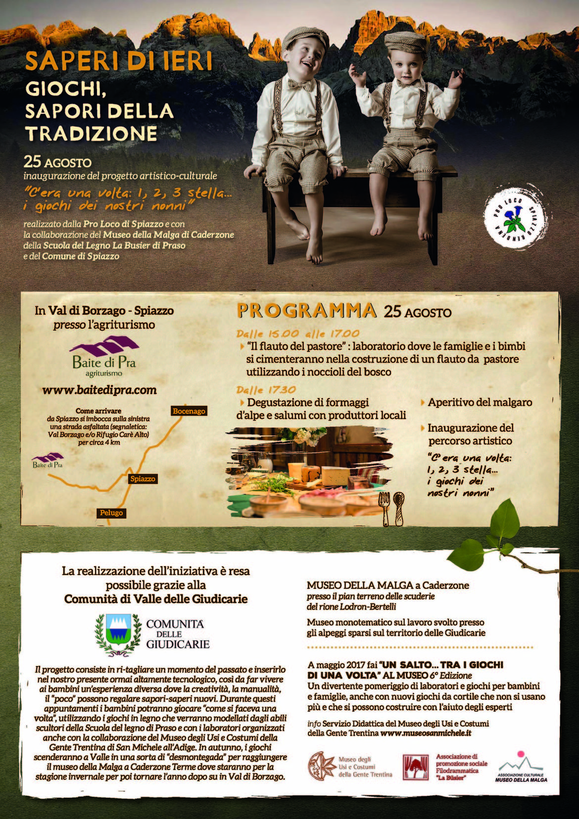 A Baite di Pra, in Val di Borzago, nel corso di un pomeriggio all’insegna del gioco e della creatività, giovedì 25 agosto sarà inaugurato il progetto artistico-culturale “C’era una volta: 1, 2, 3 stella… i giochi dei nostri nonni” ideato dalla Pro loco di Spiazzo in collaborazione con l’associazione La Busier-Scuola del legno di Praso, il Museo della Malga di Caderzone Terme e il Museo degli Usi e costumi di San Michele all’Adige.
