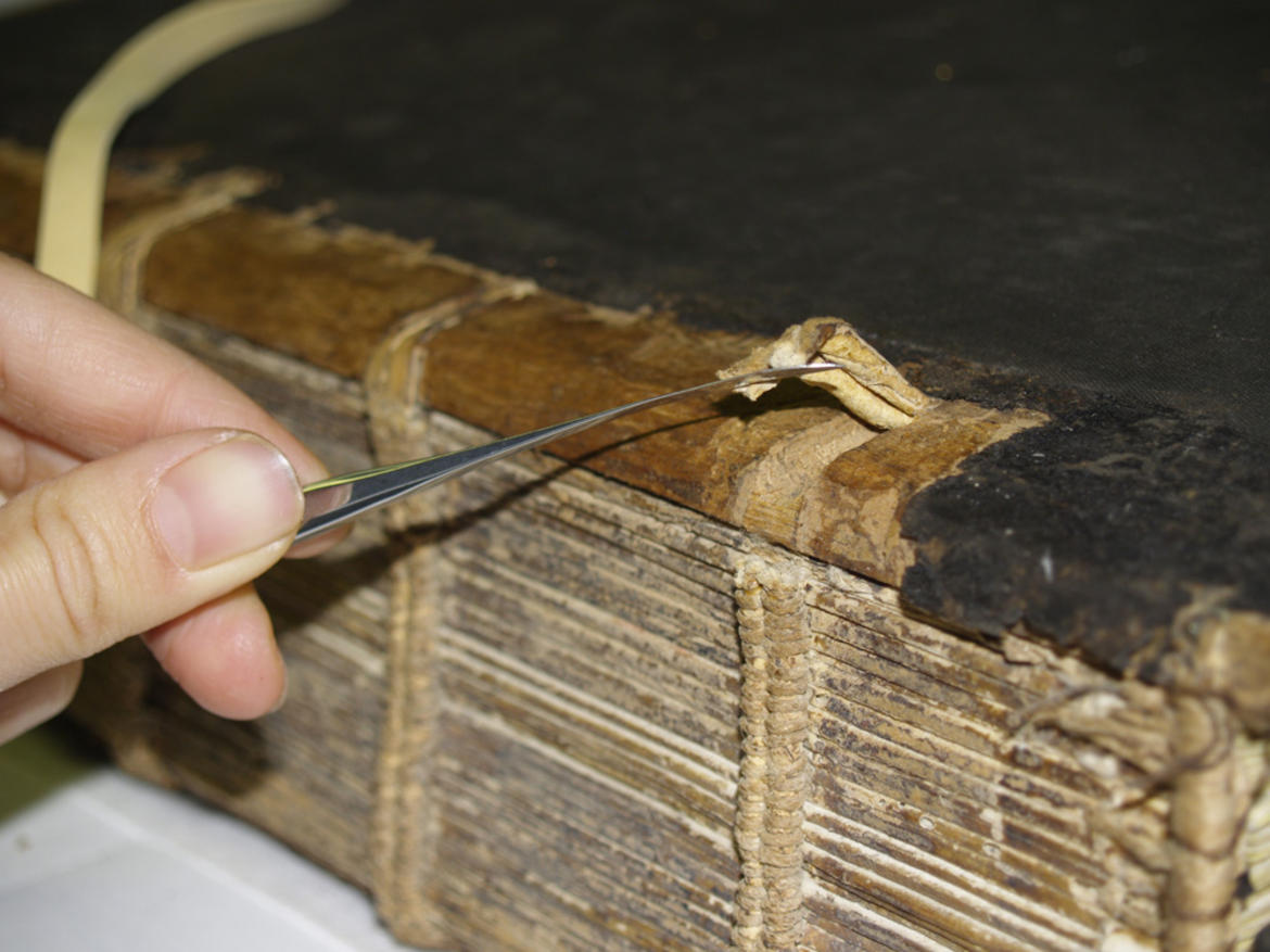 L’intervento di restauro è stato compiuto nel rispetto e nel recupero di tutte le informazioni sia sulla manifattura del volume, sia sui materiali utilizzati per il suo compimento. Si è quindi operato procedendo innanzitutto al recupero della coperta originale, togliendo tutti quelle parti in cuoio applicate in epoca più recente. Nella verifica delle condizioni della cucitura è stato possibile consolidare i nervi spezzati. Anche i capitelli sono stati fissati in modo che non possano staccarsi dalla compagine dei fascicoli. Preme precisare che i materiali usati nel condurre tutti gli interventi di restauro sono stati testati, in quanto, in virtù dei primi principi del restauro, devono essere “neutri” cioè non invasivi, e sempre “reversibili” quindi asportabili in ogni momento.