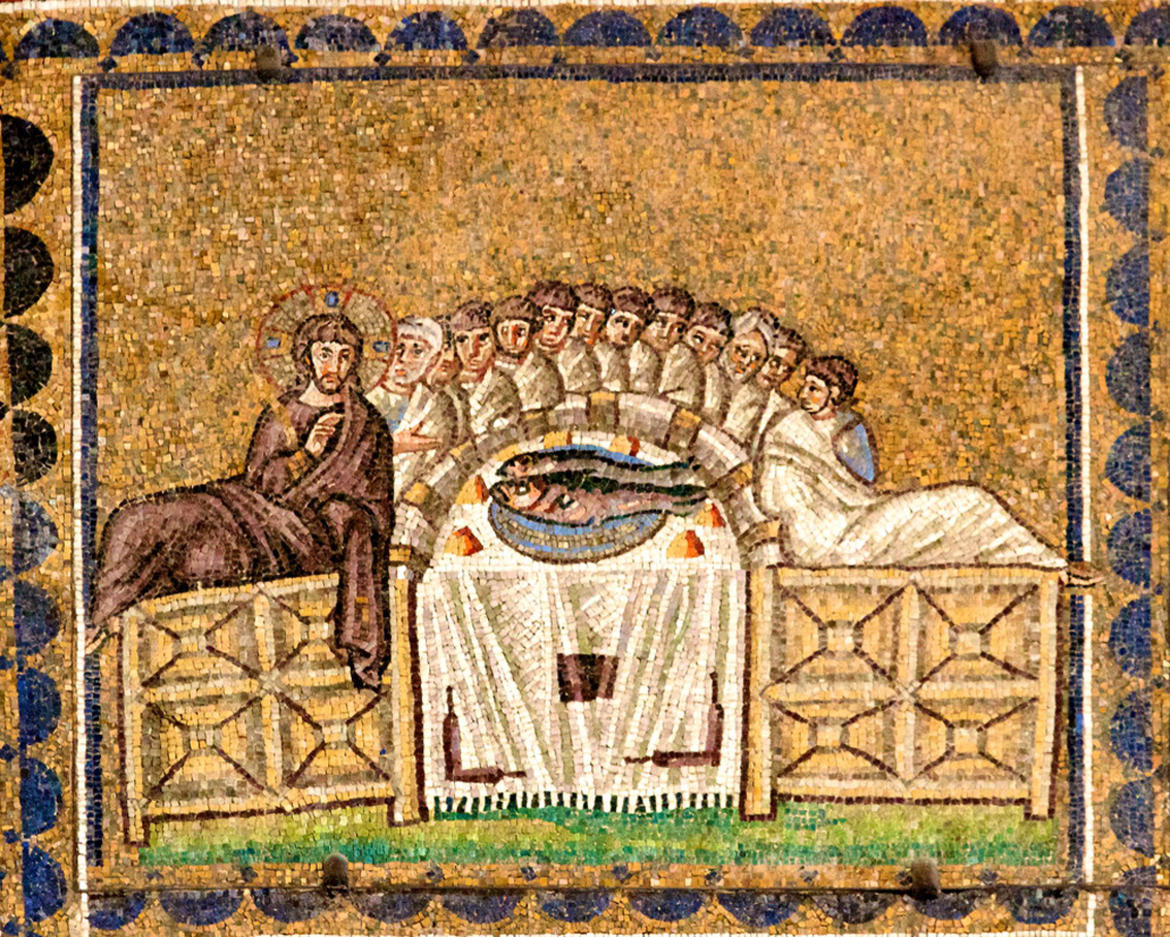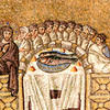 Nella più antica rappresentazione monumentale dell’Ultima Cena, quella nella basilica di Sant’Apollinare Nuovo a Ravenna, il vino però non c’è. Al centro del simposio, mirabile mosaico dei primi anni del VI secolo, si stagliano invece due grossi pesci su un vassoio. Il riferimento diretto è al miracolo della moltiplicazione effettuato da Gesù per sfamare la folla, evento prodigioso riportato da tutti e quattro gli evangelisti che assume il valore di una teofania (in favore in primo luogo dei discepoli stessi, ancora incerti e dubbiosi), ma che ha soprattutto un significato eucaristico, là dove, nella descrizione dell’evento, vengono usati i verbi “prendere”, “benedire”, “spezzare”. Come nell’Ultima Cena, appunto.