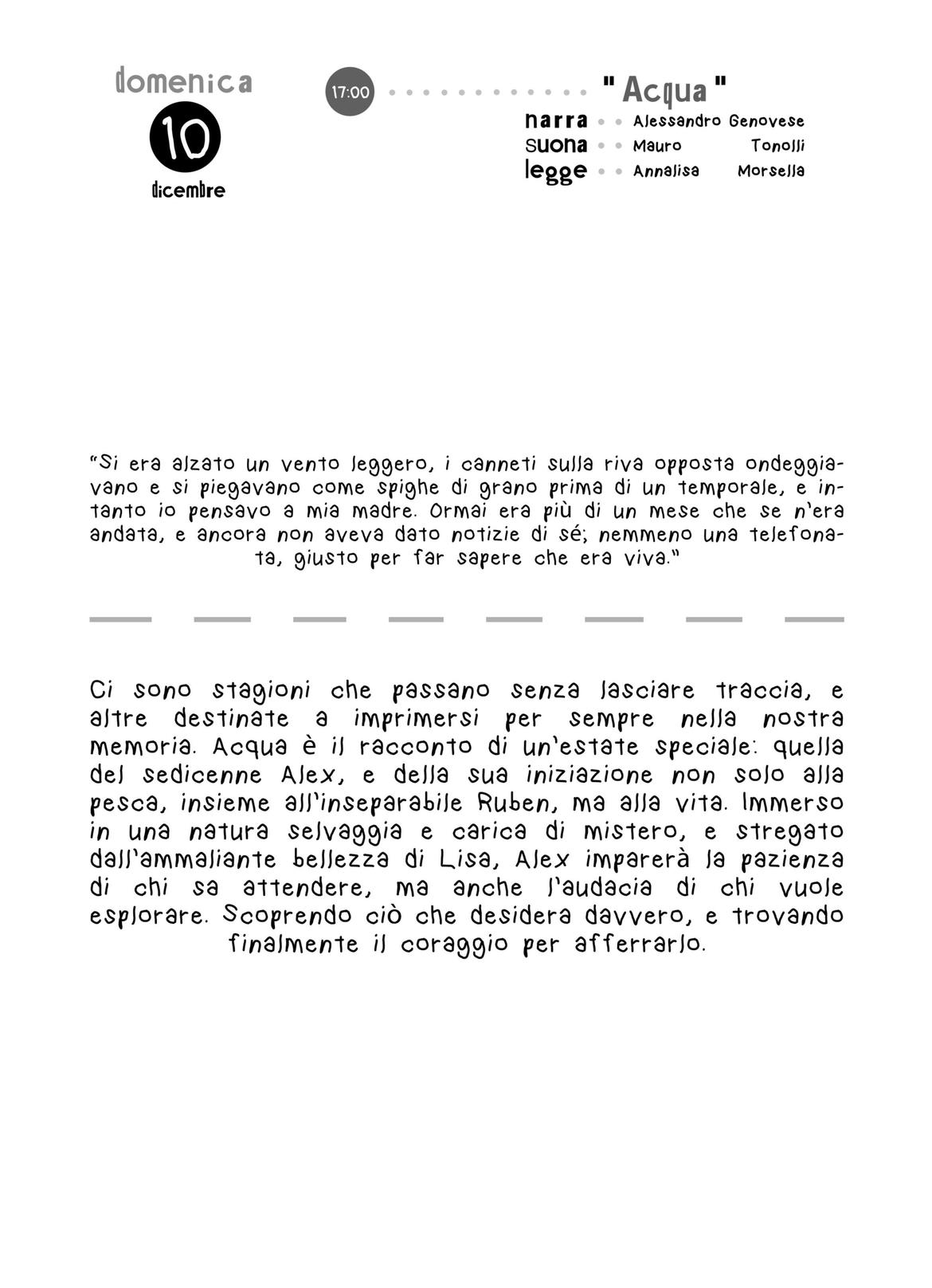 L’evento è all’insegna dell’originalità. I racconti che gli attori leggeranno in pubblico sono infatti inediti e scritti per l’occasione, come pure le musiche che li accompagneranno.