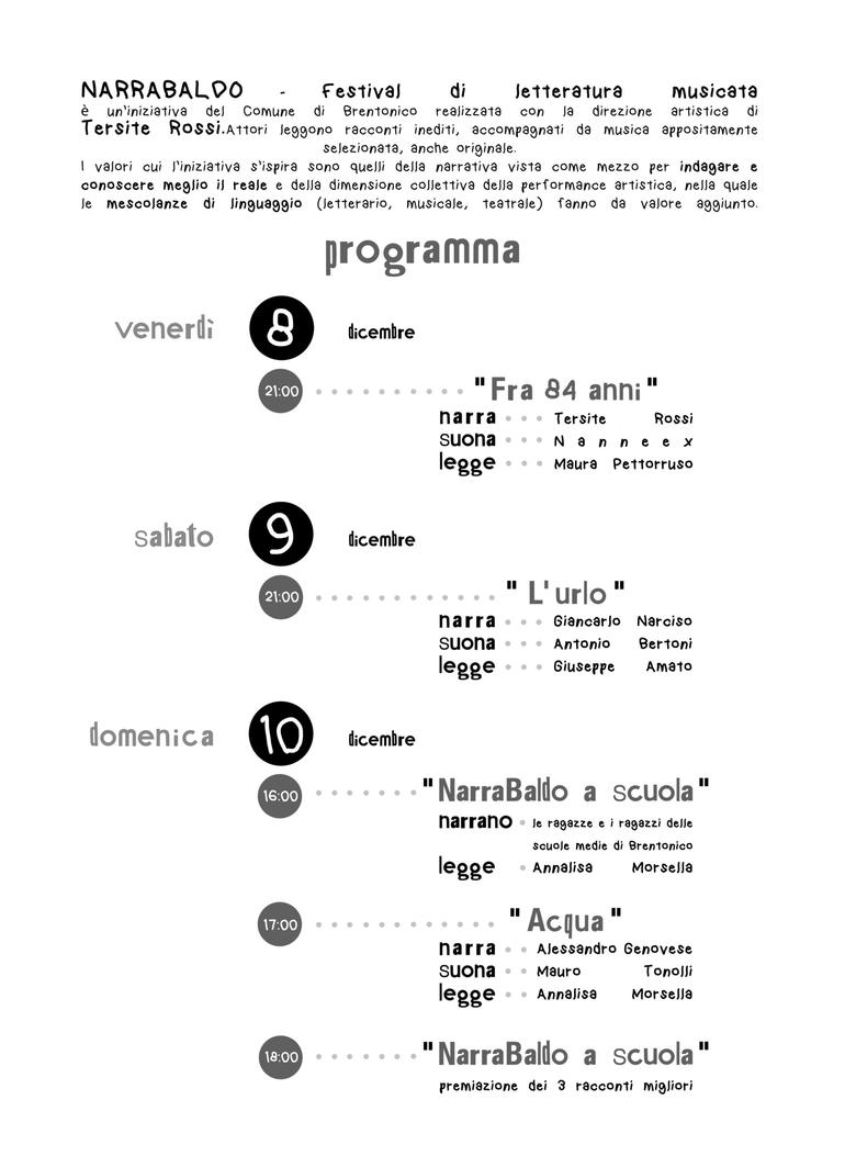 “I valori cui l’iniziativa s’ispira”, spiega il direttore artistico del festival Tersite Rossi, collettivo di scrittura formato da Marco Niro e Mattia Maistri, “sono quelli della narrativa vista come mezzo per indagare e conoscere il reale e della dimensione collettiva della performance artistica, dove la mescolanza di linguaggi (letterario, musicale, teatrale) può fare da valore aggiunto”.