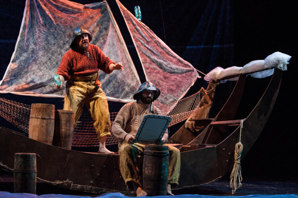 Una scena evocativa, due attori e un musicista creatore di effetti sonori. La storia verrà raccontata e vissuta da due narratori che di volta in volta prenderanno anche i ruoli dei personaggi che vanno a far rivivere sulla scena. Una tecnica di narrazione che si può definire 'in diretta'. La voce dei due attori darà di volta in volta la parola ai personaggi del racconto creando una apparente ed effimera moltiplicazione delle immagini e dei protagonisti producendo una sensazione di pienezza. Lo spettatore assiste alle avventure del peschereccio "We're here" convinto che sul palcoscenico si presentino tutti i protagonisti.