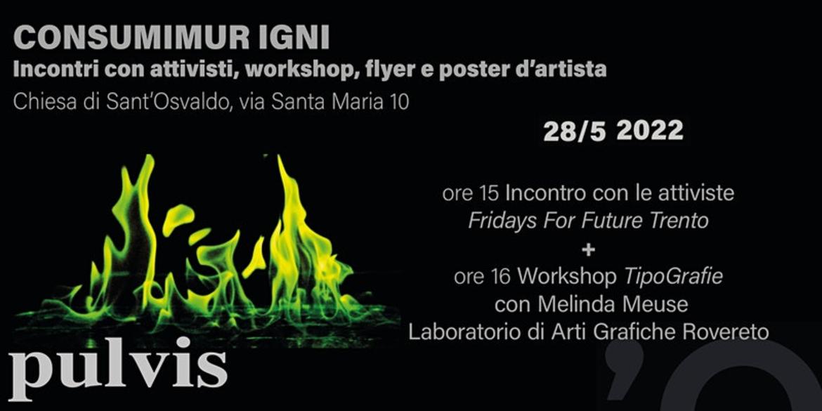Consumimur Igni è il tentativo di mettere in dialogo arte e creatività con le istanze proposte da alcuni attivisti dei gruppi Extinction Rebellion Trentino e Fridays For Future Trento, i quali proporranno temi e osservazioni da rielaborare visivamente in un laboratorio di produzione di manifesti e volantini.