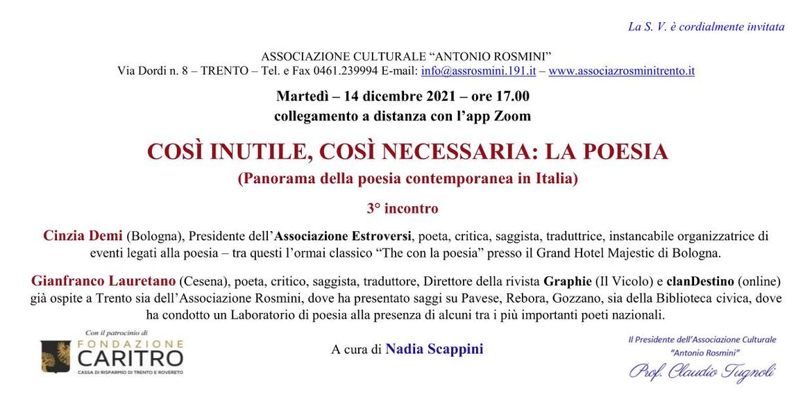 Gianfranco Lauretano (Cesena), poeta, critico, saggista, traduttore, Direttore della rivista Graphie (Il Vicolo) e clanDestino (online) già ospite a Trento sia dell’Associazione Rosmini, dove ha presentato saggi su Pavese, Rebora, Gozzano, sia della Biblioteca civica, dove ha condotto un Laboratorio di poesia alla presenza di alcuni tra i più importanti poeti nazionali.
