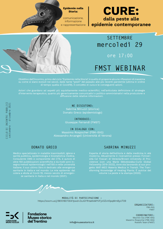 Obiettivo dell’incontro, primo del ciclo “Epidemie nella Storia”, è quello di proporre alcune riflessioni di massima su come si siano evoluti nei secoli, dalle tante “pesti” del passato alle più recenti pandemie (ultima in ordine di tempo quella di Covid19), il concetto di cura e le conseguenti azioni.