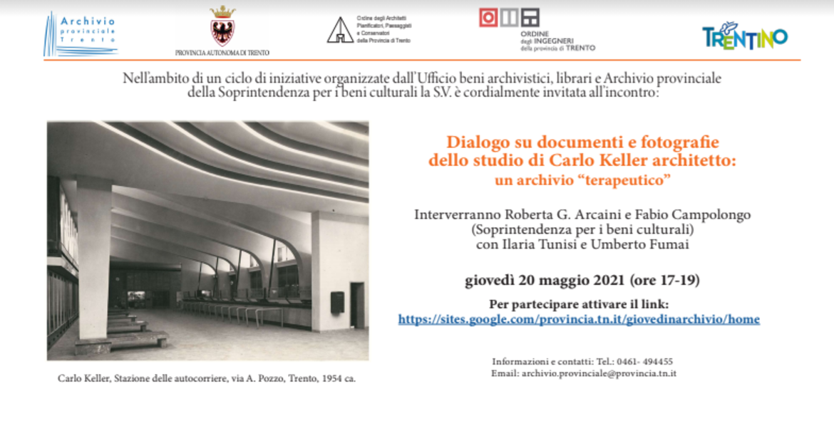 Giovedì 20 maggio 2021 (ore 17-19) si svolgerà, in modalità a distanza, un Dialogo su documenti e fotografie dello studio di Carlo Keller architetto: un archivio “terapeutico” durante il quale interverranno Roberta G. Arcaini e Fabio Campolongo (Soprintendenza per i beni culturali) con Ilaria Tunisi e Umberto Fumai.
