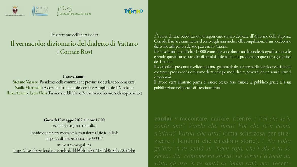 "Il vernacolo: dizionario del dialetto di Vattaro" di Corrado Bassi è un'opera di oltre 13.000 lemmi caratteristici dell'Altopiano della Vigolana che va a colmare una lacuna lessicografica dopo che per altre aree, quali quella di Trento, della Val di Cembra, della Valsugana e del Roveretano, sono stati editi nel corso degli anni specifici dizionari dialettali.