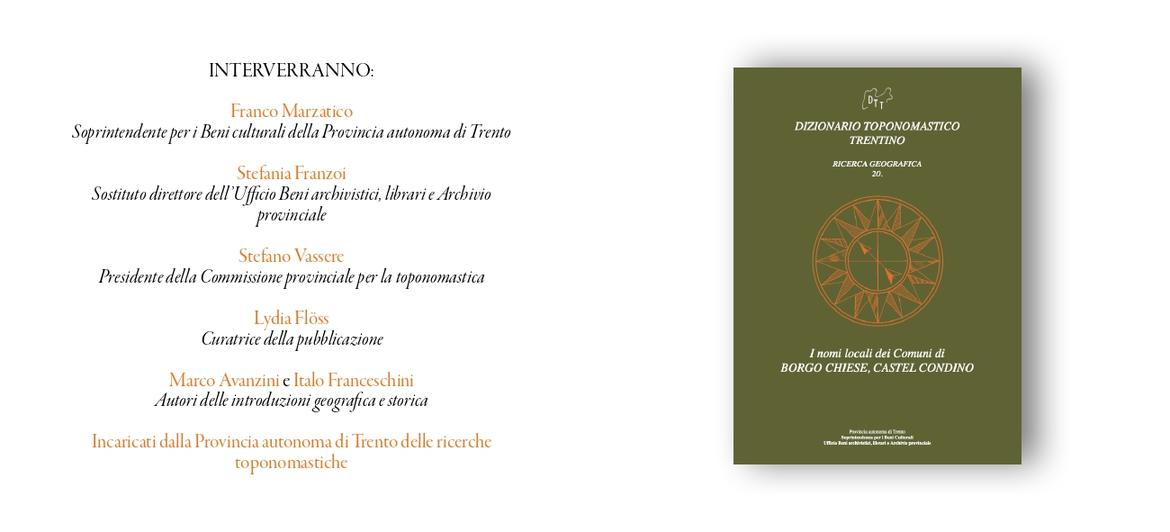 Il 6 giugno al palazzetto polifunzionale di Condino-Borgo Chiese verrà presentato il nuovo numero, il XX volume del Dizionario toponomastico trentino "I nomi locali dei Comuni di Borgo Chiese e Castel Condino" con: