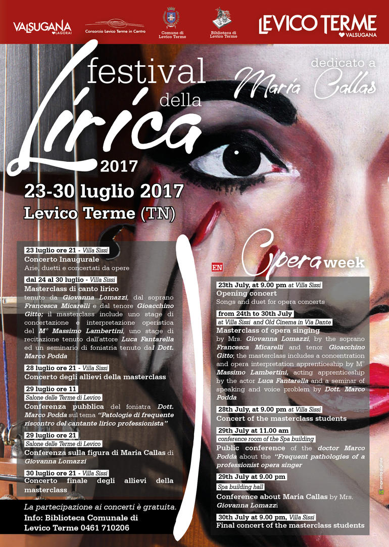L’Assessorato alla Cultura, in collaborazione con l’APT Azienda Promozione Turistica di Levico Terme promuove una settimana della lirica dedicata a Maria Callas. Nell’ambito della rassegna si terrà una masterclass rivolta a tutti i cantanti lirici, studenti e professionisti, senza limiti di età volto al perfezionamento tecnico, espressivo ed attoriale.