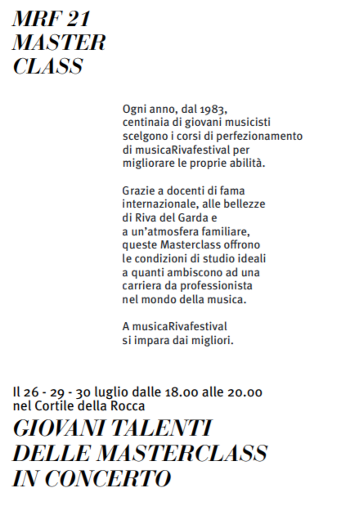 Grazie a docenti di fama internazionale, alle bellezze di Riva del Garda e a un’atmosfera familiare, queste Masterclass offrono le condizioni di studio ideali a quanti ambiscono ad una carriera da professionista nel mondo della musica.