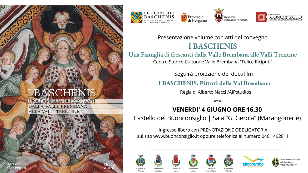 A completamento delle iniziative promosse nell’ambito del progetto “Le Terre dei Baschenis”, venerdì 4 giugno alle ore 16:30 nel Castello del Buonconsiglio di Trento e, successivamente, venerdì 11 giugno alle ore 17:30 nel cortile del Palazzo della Provincia di Bergamo verranno presentati gli atti del Convegno di studi “I BASCHENIS. Una famiglia di frescanti dalla Valle Brembana alle Valli Trentine”, organizzato in collaborazione con enti culturali e istituzioni bergamasche e trentine: Ufficio Beni Culturali della Diocesi di Bergamo, Centro Studi sul Territorio dell’Università di Bergamo, Comune di Bergamo, Accademia Carrara, Soprintendenza di Bergamo e Brescia, Provincia Autonoma di Trento, Soprintendenza Beni Culturali di Trento, Castello del Buonconsiglio e Centro Studi Val di Sole.