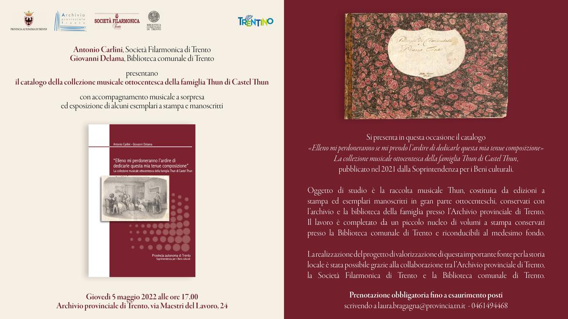 Il catalogo è stato pubblicato nel 2021 dalla Soprintendenza per i Beni culturali nella collana “Biblioteche e bibliotecari del Trentino”. È dedicato alla raccolta musicale Thun, costituita da edizioni a stampa ed esemplari manoscritti in gran parte ottocenteschi, conservati con l’archivio e la biblioteca della famiglia presso l’Archivio provinciale di Trento.