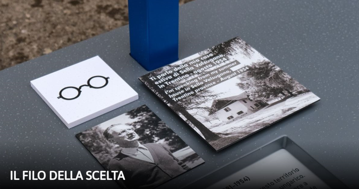 Un’occasione dunque per arricchire di storia e di storie la visita a questo luogo di bellezza, dove la natura racconta il sogno europeo attraverso un potente richiamo metaforico. Il filo della scelta infatti permette di incontrare alcuni grandi testimoni del passato che si raccontano al pubblico senza retorica, come in una confessione intima e sincera. Konrad Adenauer, Robert Schuman, Altiero Spinelli, Vaclav Havel, Simone Jacob Veil, Louise Weiss, Ursula Hirschmann, Giannantonio Manci, Sophie Scholl, Bronislaw Geremek e Éliane Vogel-Polsky e naturalmente Alcide De Gasperi: sono i loro i protagonisti di questo progetto che non è una mostra, non è una performance, ma è un invito a incontrare il passato e a specchiarsi in esso, riscoprendo anche il nostro filo della scelta…