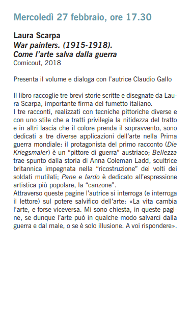 Il libro raccoglie tre brevi storie scritte e disegnate da Laura Scarpa, importante firma del fumetto italiano. I tre racconti, realizzati con tecniche pittoriche diverse e con uno stile che a tratti privilegia la nitidezza del tratto e in altri lascia che il colore prenda il sopravvento, sono dedicati a tre diverse applicazioni dell’arte nella Prima guerra mondiale: il protagonista del primo racconto (Die Kriegsmaler) è un “pittore di guerra” austriaco; Bellezza trae spunto dalla storia di Anna Coleman Ladd, scultrice britannica impegnata nella “ricostruzione” dei volti dei soldati mutilati; Pane e lardo è dedicato all’espressione artistica più popolare, la “canzone”.Attraverso queste pagine l’autrice si interroga (e interroga il lettore) sul potere salvifico dell’arte: «La vita cambia l’arte, e forse viceversa. Mi sono chiesta, in queste pagine, se dunque l’arte può in qualche modo salvarci dalla guerra e dal male, o se è solo illusione. A voi rispondere».