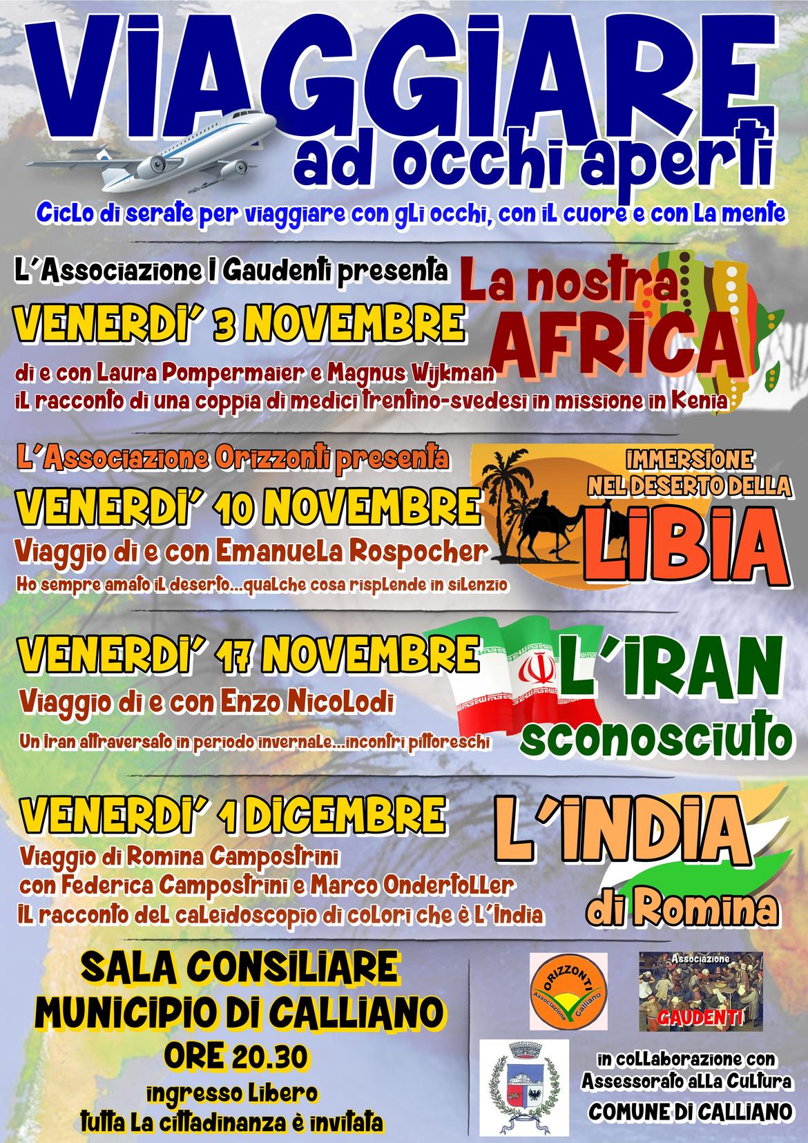 Le Associazioni "I Gaudenti" e "Orizzonti" in collaborazione con l'Assessorato alla Cultura del Comune di Calliano organizzano questo ciclo di incontri di presentazione di viaggi in Africa, Libia, Iran e India.