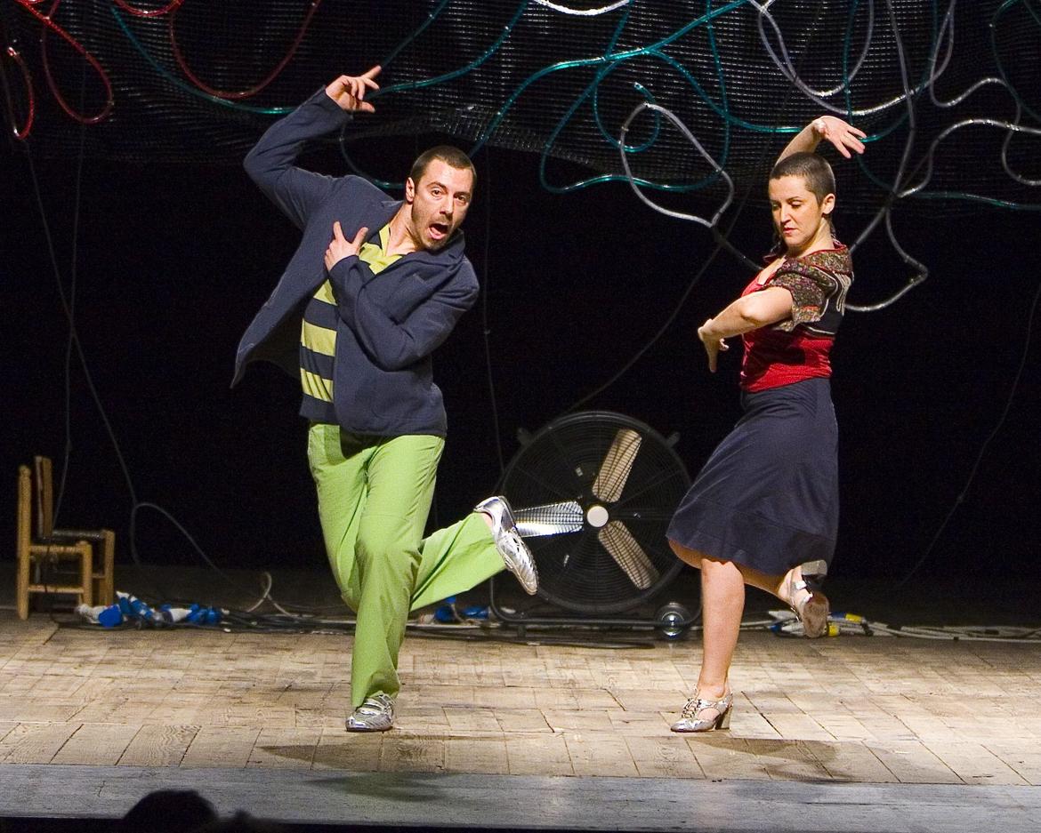Lo spettacolo procede per accumulo, fotografa, condensa e fagocita quello che ci circonda: i continui messaggi che ci arrivano, il bisogno di catalogare, sistemare e ordinare tutto. Procede per accostamenti, intersezioni e spostamenti di senso. Le scene non iniziano e non finiscono. Vengono continuamente interrotte, morsicate. Le immagini e le parole nascono e muoiono di continuo. Gli attori non recitano. La musica è sempre presente e detta la logica con cui le cose accadono. Come in un video-clip.