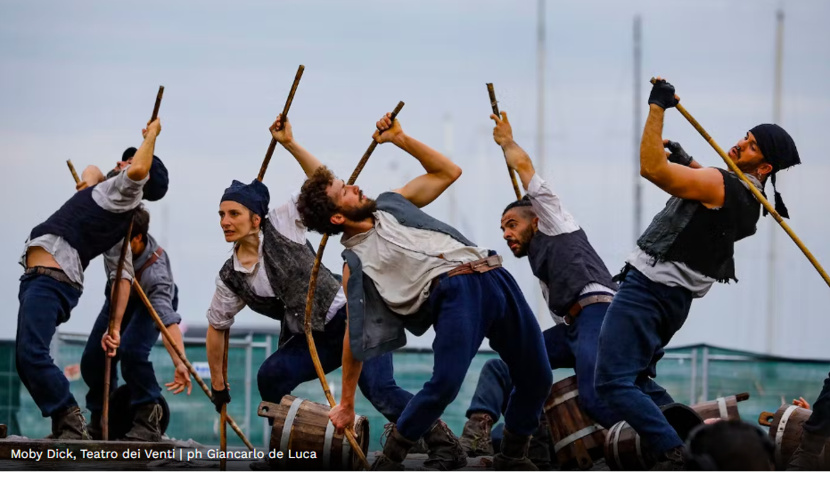 Ispirato al romanzo di Herman Melville, il Moby Dick della Compagnia Teatro dei Venti è un avvicendarsi di lotte e allegre scorribande da cui emergono storie e persone. La nave è guidata dall’ombra del terribile capitano Achab che si lancia alla caccia della mostruosa balena bianca, trascinando con sé l’intero equipaggio in un finale faccia a faccia.