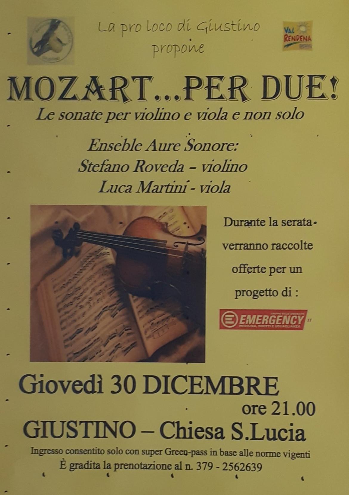 Giovedi 30/12/21 a Giustino (TN) alle ore 21:00, presso la Chiesa di Santa Lucia, concerto dell’Ensemble Aure Sonore. Sonate per violino e viola di W.A.Mozart ...e non solo. L’evento è organizzato dalla Pro Loco di Giustino.