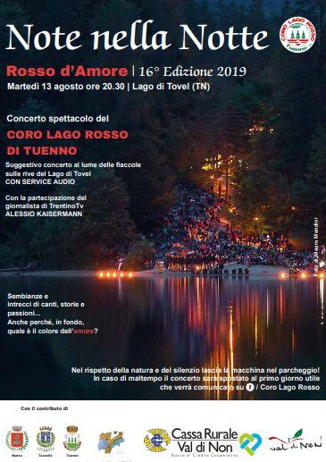 “Note nella notte” è una proposta culturale accolta ogni anno da un pubblico sempre più numeroso ma attento e rispettoso, uno spettacolo en plein air in uno fra i luoghi più magici del Trentino, caratterizzato da semplicità e autenticità: le voci umane, il fuoco delle fiaccole, l'unicità del Lago di Tovel, le Dolomiti di Brenta.