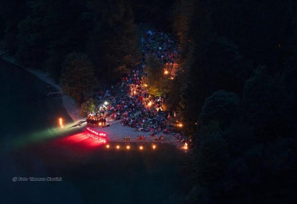 Un anfiteatro naturale che toglie il fiato, un'atmosfera fiabesca dove il pubblico si stringe attorno al Coro con grande rispetto, attenzione e spirito di adattamento (adagiandosi su coperte proprie o “seggiole naturali”), la luce mistica delle fiaccole che si riverbera sulla acque del Lago e, protagoniste su tutto, le voci e i canti di montagna legati dal filo conduttore dell’Amore.