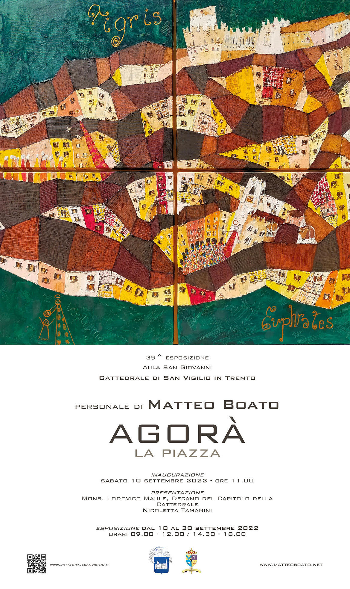 La mostra personale “Agorà”, con più di una ventina di dipinti realizzati da Boato in varia data, tocca centri e città conosciute e amate dal pittore trentino come Trento, Bolzano, Venezia, Trieste, Pisa, Firenze, Milano, Roma, Burano, Gubbio, Riga e il celebre Santuario di Santiago de Compostela, focalizzandosi, come detto, sull’interesse dell’artista trentino per i luoghi dell’incontro e dello scambio per eccellenza, le piazze, i luoghi laici dell’incontro, e le antiche cattedrali, da secoli luoghi di dialogo tra uomini e dell’uomo con il suo Creatore.