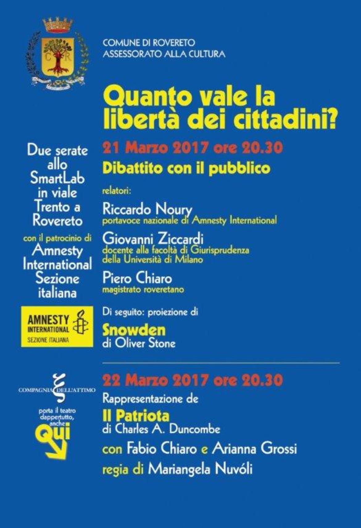 verrà proiettato il film “Snowden” di Oliver Stone. La proiezione sarà preceduta da un dibattito al quale interverranno Riccardo Noury, portavoce nazionale di Amnesty International Italia, Giovanni Ziccardi, professore di Informatica Giuridica presso l’Università di Milano, e Piero Chiaro, magistrato roveretano in pensione.