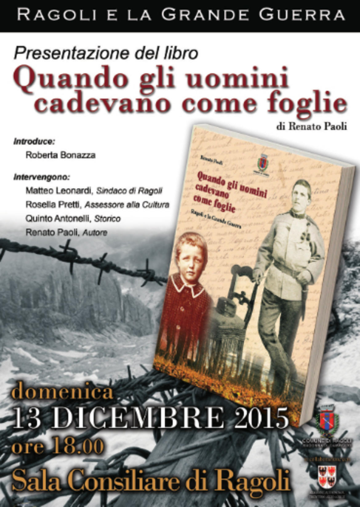 Il libro “Quando gli uomini cadevano come foglie” racconta la storia di un piccolo villaggio di montagna negli anni terribili della Prima Guerra Mondiale. Gli eventi di quegli anni, che hanno sconvolto prima l’Europa e poi il mondo, hanno deciso drammaticamente la sorte di decine di milioni di persone, tra combattenti e civili, hanno determinato sconvolgimenti politici e istituzionali, hanno accelerato processi economici e sociali di enorme portata. Nella massa umana coinvolta nel conflitto, rischia di perdersi ogni individualità: se si sfogliano i libri di storia e le centinaia di migliaia di pagine scritte sulle ragioni della guerra, sui suoi caratteri originali, sul logoramento prodotto dalle trincee, sulle innovazioni tecnologiche introdotte, sull’indotto economico e industriale da essa determinato o sulla crisi morale, sociale ed economica in cui l’Europa si trova sprofondata alla sua conclusione, nulla si trova che renda giustizia dei milioni di vite stroncate nel pieno del loro vigore, delle centinaia di migliaia di famiglie che vedono distrutta, senza preavviso, la loro integrità. Si può rimanere inorriditi davanti all’imponenza del numero delle vittime, che, non a caso, ha avuto un impatto psicologico senza precedenti sulla società europea e che, nonostante nei decenni successivi si siano verificati conflitti e tragedie molto peggiori, non si è più ripetuto. E tuttavia l’ordine spropositato del numero provoca, a causa dell’anonimato in cui sono confinate le vittime, l’effetto paradossale di rendere impossibile l’avvertire sulla propria pelle il dramma vero, reale delle donne e degli uomini che cento anni fa hanno avuto in sorte di vivere quella terrificante esperienza. Lo ha detto bene Guerrino Botteri, soldato giudicariese in Galizia e autore di un diario in cui ci ha lasciato la testimonianza della sua esperienza di guerra: