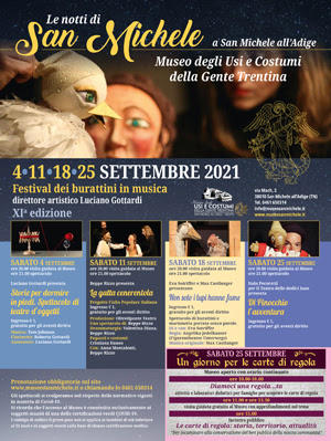 Anche quest’anno il Museo propone quattro spettacoli per “Le notti di San Michele” durante il mese di settembre. A partire da sabato 4 è in programma il “Festival dei burattini in musica”: appuntamenti di teatro di figura da non perdere con accompagnamento musicale dal vivo che si rivolgono a un pubblico di tutte le età. La direzione artistica del Festival è curata ormai da undici edizioni, da Luciano Gottardi, burattinaio trentino che da anni collabora con il Museo. Alle quattro serate si aggiunge sabato 25 settembre un’intera giornata dedicata alle carte di regola del Trentino, con attività per famiglie, visite guidate a tema e un incontro pubblico con diversi esperti qualificati.