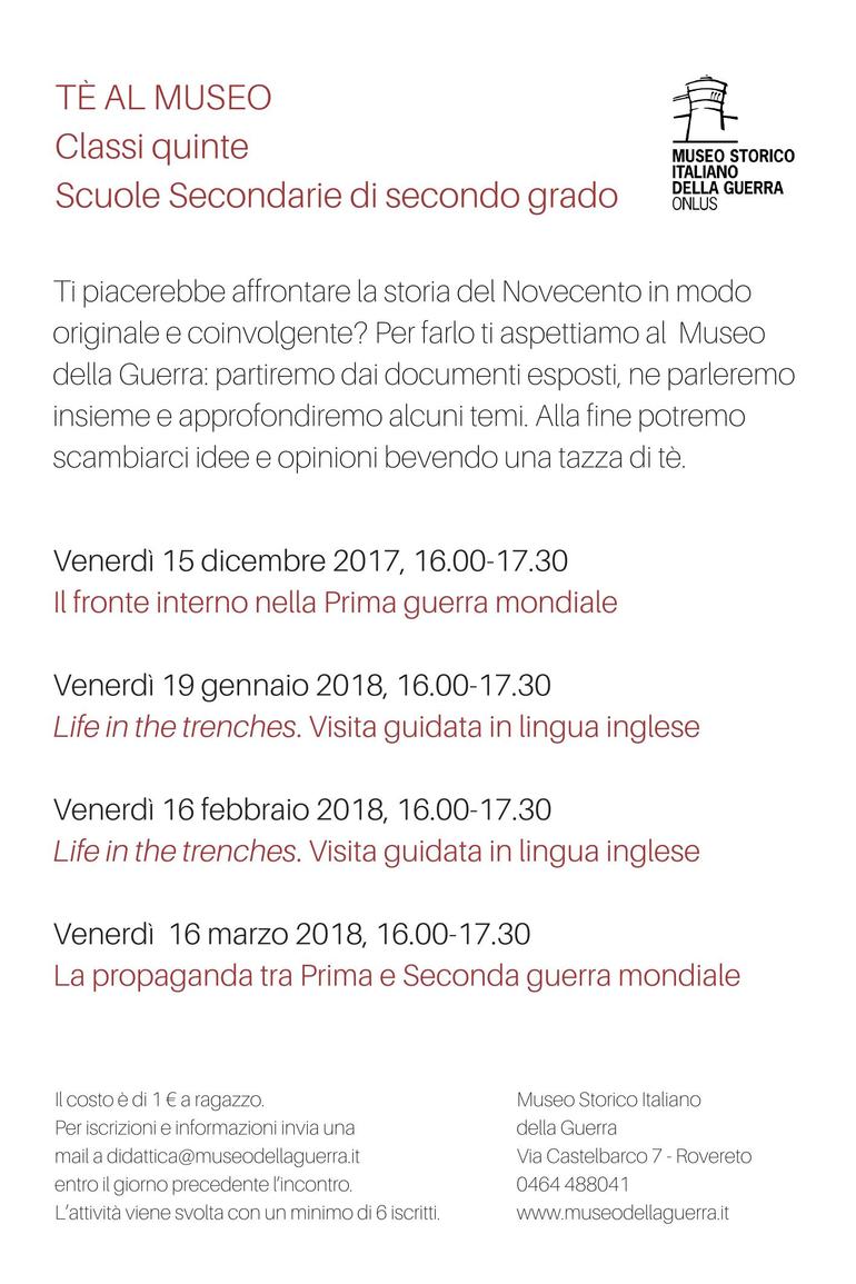 Nell’incontro di oggi, partendo dagli oggetti esposti nelle sale, parleremo dell’esperienza dei soldati nelle trincee della Prima guerra mondiale. La visita verrà svolta in lingua inglese: sarà l’occasione per guardare al passato con un occhio diverso e mettere alla prova le proprie competenze in campo linguistico. Al termine dell’incontro è previsto un piccolo momento conviviale, pensato come occasione per discutere insieme e confrontarsi.