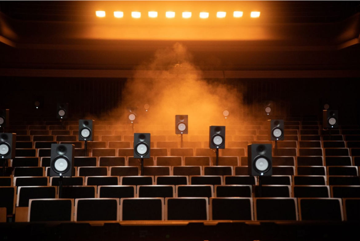 Una platea vuota fa da palcoscenico a un concerto senza corpi.