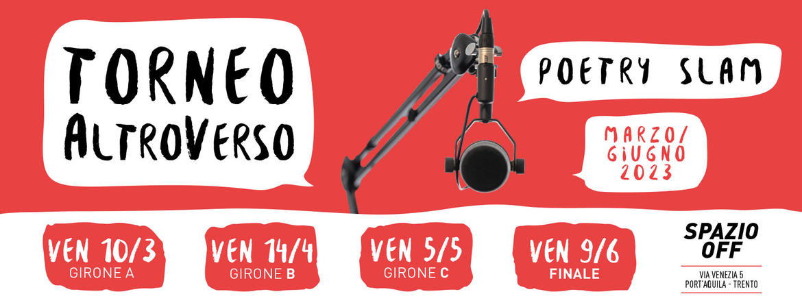 Il Poetry Slam è una competizione aperta a tutti: poeti e poetesse recitano i loro versi, gareggiano fra loro e vengono valutati dal pubblico. Il torneo AltroVerso 2023 prevede tre gironi di qualificazione: i primi due classificati nei tre gironi accedono alla finalissima di venerdì 9 giugno. Il vincitore del torneo parteciperà alle semifinali provinciali di ‘poetry slam’ e concorrerà alla qualificazione per le finali nazionali 2022. In gara per questo primo turno Martina Belelli, Kadija Idrissi, Giadadea Canobbio, Davide Scarin, Giulia Cassandra e Marta Moientale. Partecipa anche tu alla prima serata di venerdì 10 marzo dalle ore 21 allo Spazio Off!