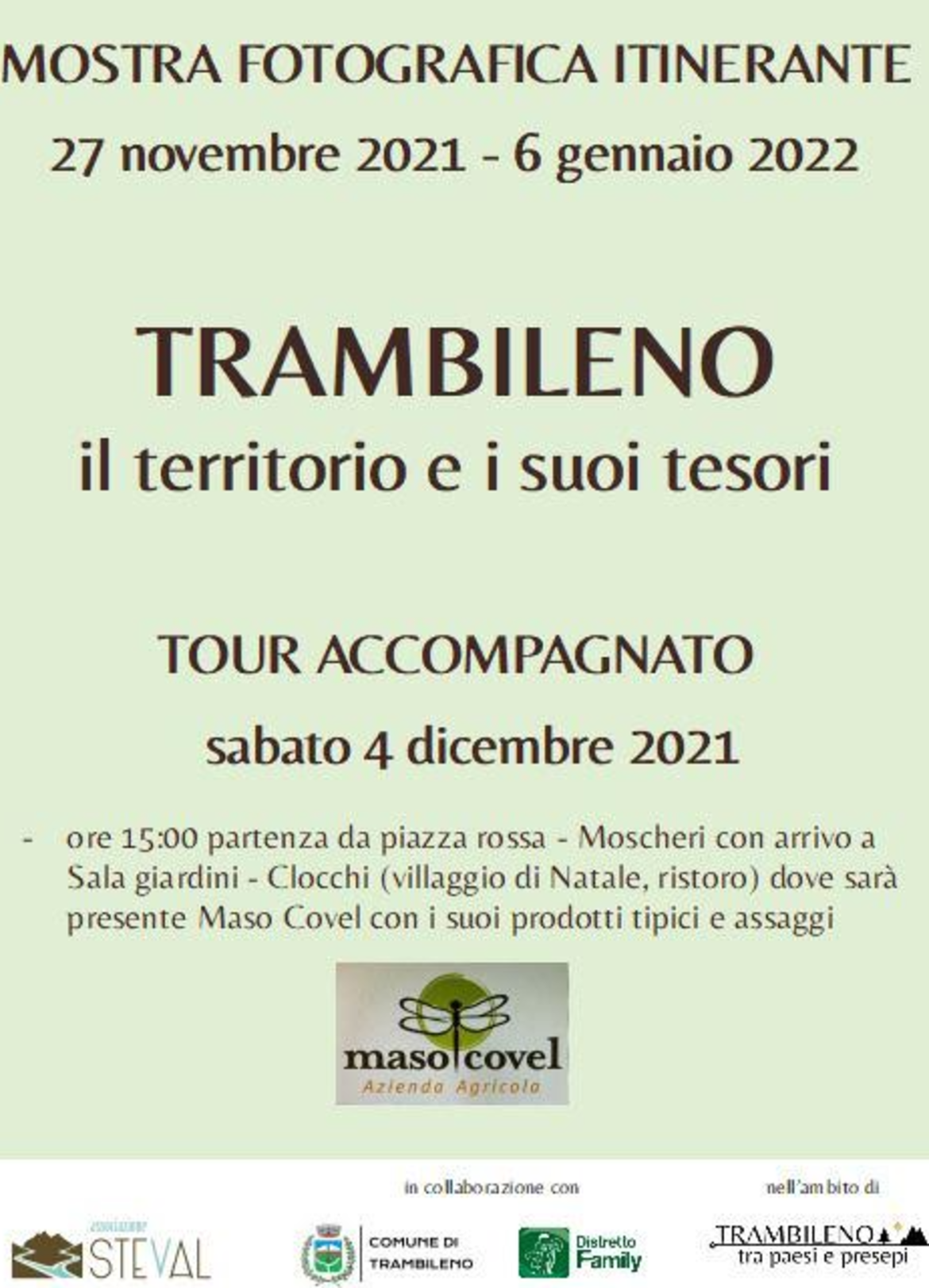nell'ambito della rassegna natalizia "Trambileno tra paesi e presepi" - promossa dal Comune di Trambileno - segnalo in particolare l'appuntamento per sabato 4 dicembre 2021 organizzato dalla scrivente associazione:- ore 15:00 tour accompagnato in visita alla mostra fotografica itinerante "Trambileno - il territorio e i suoi tesori". Partenza da piazza rossa a Moscheri con arrivo a Sala giardini - frazione Clocchi dove sarà presente Maso Covel con i suoi prodotti tipici ed assaggi. La prenotazione è consigliata 3491673279).Trattasi di una mostra fotografica nelle frazioni di Moscheri, Lesi e Clocchi abbinata alla scoperta dei presepi realizzati da privati ed associazioni nelle medesime frazioni. Ben 13 fotografi del territorio hanno partecipato con i loro scatti immortalando Trambileno secondo il loro punto di vista.