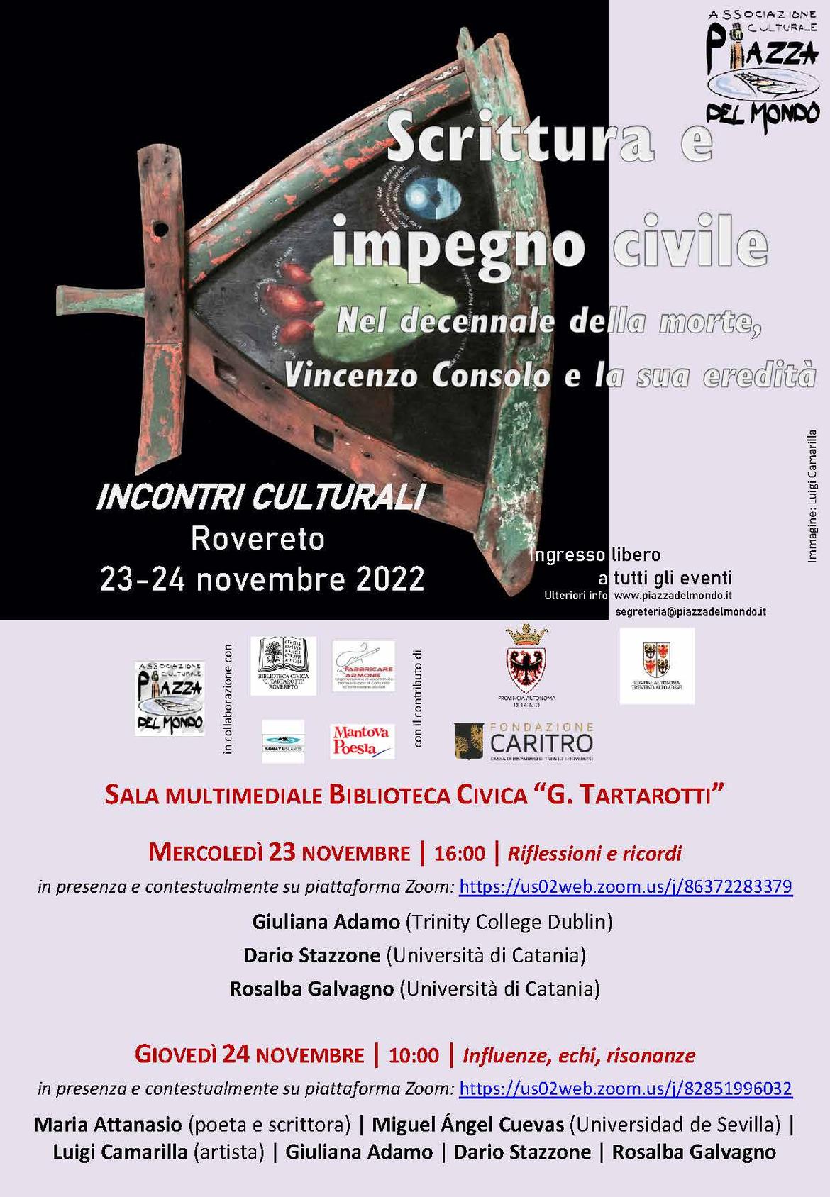 Una serie di incontri culturali, nei giorni di mercoledì 23 novembre (dalle ore 16) e di giovedì 24 novembre (dalle ore 10), organizzati da Associazione Culturale “Piazza del Mondo” in collaborazione con la Biblioteca Civica “G. Tartarotti” di Rovereto, sono dedicati al tema della scrittura e dell’impegno civile, attraverso la chiave dell’esperienza significativa dello scrittore Vincenzo Consolo, nel decennale dalla morte.