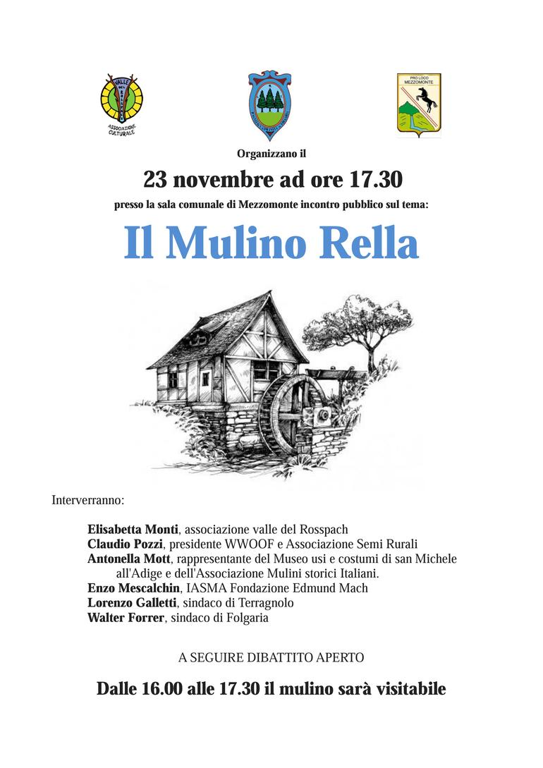 Il mulino Rella ha due macine da grano, oltre a un brillatoio e una pila da orzo, mossi un tempo da due ruote idrauliche, di cui una azionava anche una sega circolare e una piallatrice. L’acqua viene prelevata dal torrente a monte del mulino e condotta alla ruota tramite un canale di 110 metri di lunghezza. Il mulino, che era proprietà di una famiglia di mugnai da tre generazioni, è rimasto in attività fino agli anni cinquanta. Nel 1998 è stato acquistato dal Comune di Folgaria.