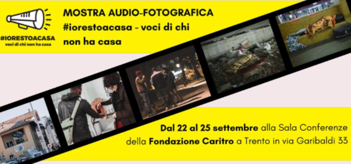 Dal 22 al 25 settembre alla Sala Conferenze della Fondazione Caritro si terrà la mostra audio-fotografica del Progetto "#iorestoacasa - Voci di chi non ha casa".La mostra sarà un’occasione per presentare alla popolazione le testimonianze raccolte dal Progetto che raccontano vite ed esperienze di persone senza dimora a Trento, persone che hanno vissuto nella pandemia e specie nei periodi di lockdown un peggioramento drammatico delle proprie già fragili condizioni di vita.Nella mostra i visitatori potranno ascoltare il podcast del progetto, realizzato dai collaboratori Davide Grotta e Gabriele Borghi a partire da dodici interviste a persone senza dimora, e vedere le foto scattate scattate dal giovane fotografo Oleh Rud che ritraggono la Trento vissuta dalle persone senza dimora.