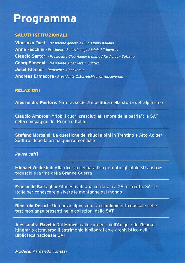 Saluti istituzionali di: Vincenzo Torti (presidente generale CAI), Anna Facchini (presidente SAT), Claudio Sartori (presidente CAI Alto Adige), Georg Simeoni (presidente Alpenverein Südtirol), Josef Klenner (Deutscher Alpenverein), Andreas Ermacora (presidente Österreichischer Alpenverein).