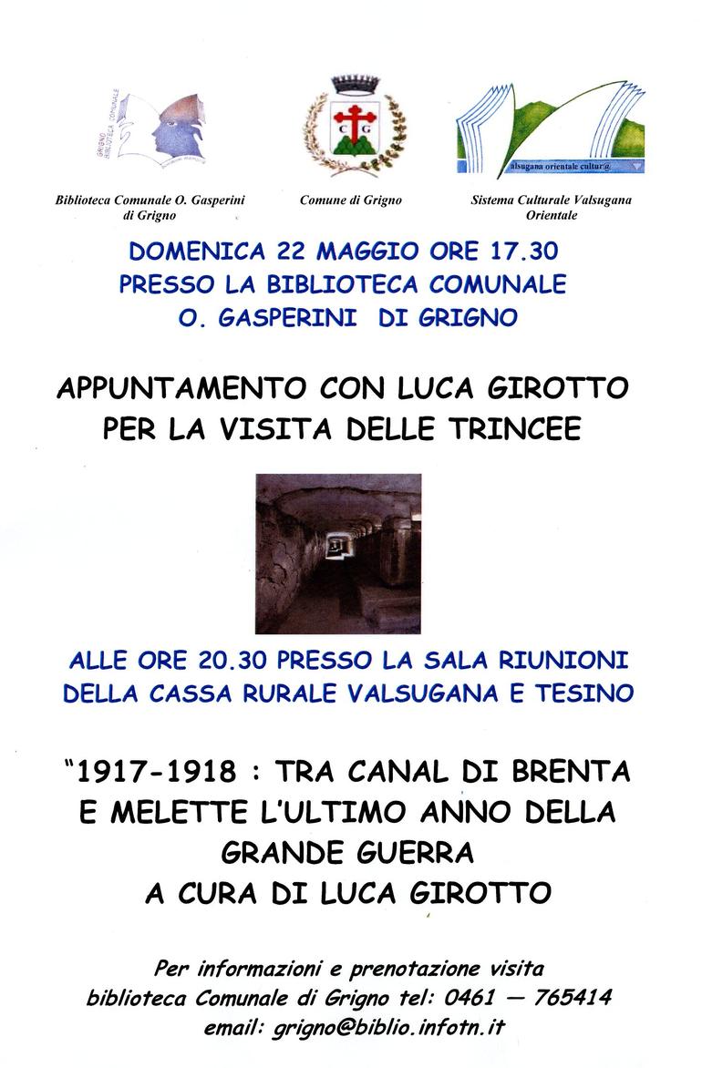 Alle ore 17.30 visita guidata alla Trincea di Grigno con Luca Girotto. Appuntamento davanti alla Biblioteca Comunale. Richiesta prenotazione in Biblioteca.