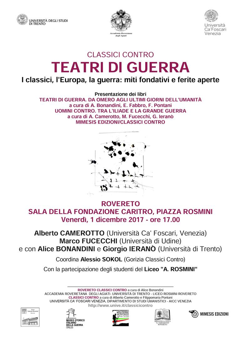 Con gli autori Alberto Camerotto (Università Ca' Foscari, Venezia) e Marco Fucecchi (Università di Udine), coordina Alessio Sokol (Gorizia). Introducono Alice Bonandini e Giorgio Ieranò. Con la partecipazione del Liceo "A. Rosmini". A cura dell'Accademia degli Agiati e con la collaborazione di "Classici Contro", del Museo Storico Italiano della Guerra e della Biblioteca Civica "G. Tartarotti" di Rovereto.