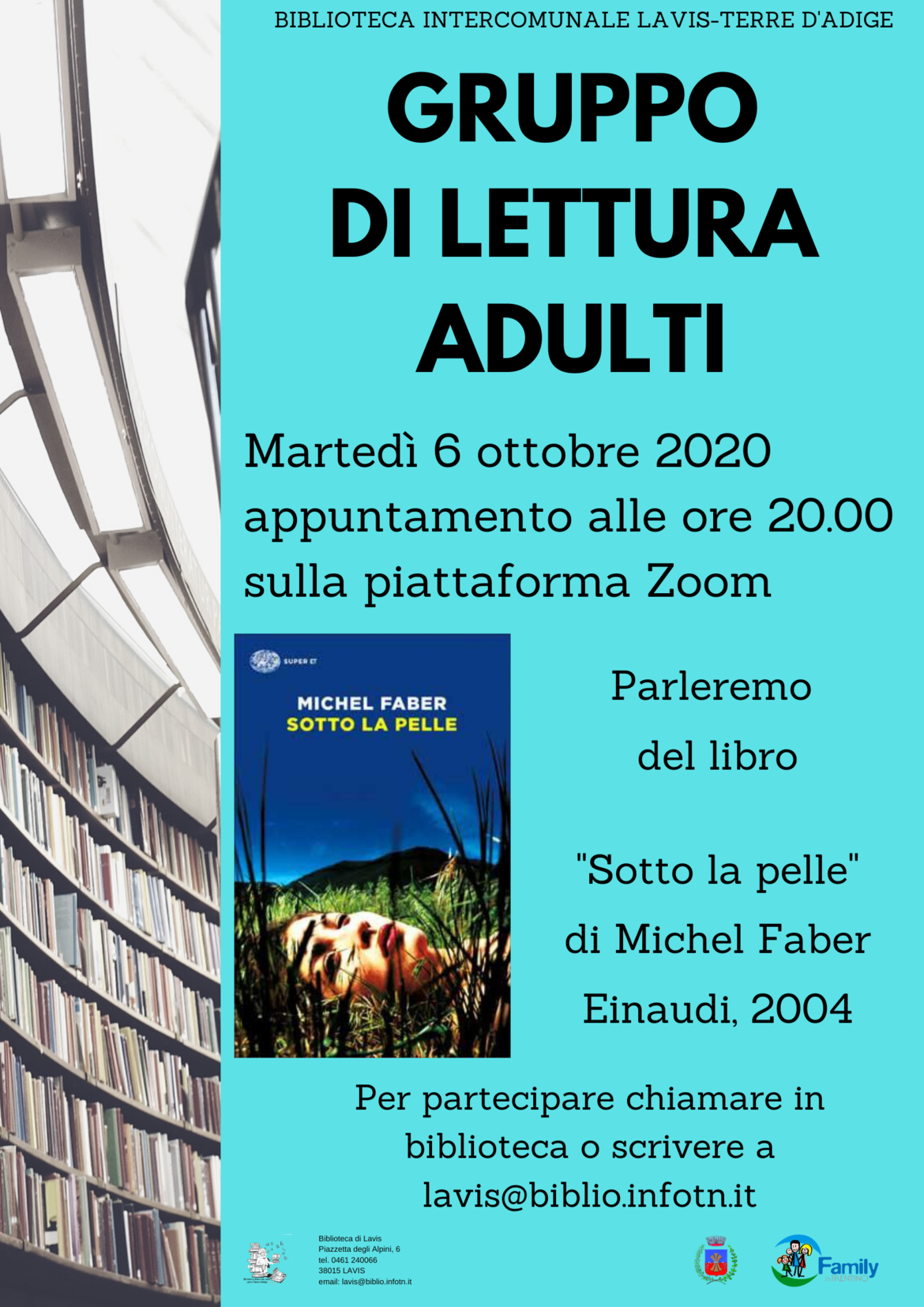Nell'incontro, aperto a tutti, si parlerà del libro "Sotto la pelle" di Michel Faber (Einaudi, 2004); per partecipare è sufficiente chiamare in biblioteca (0461 240066) o scrivere a lavis@biblio.infotn.it.