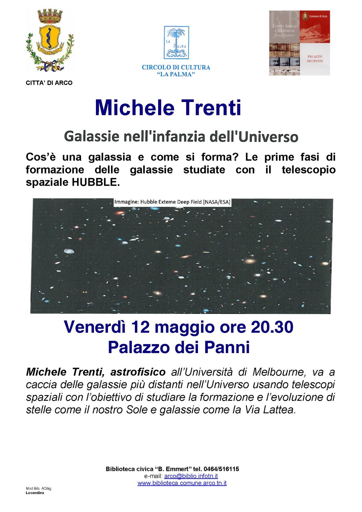 La cittadinanza è invitata all'incontro con l'arcense Michele Trenti, astrofisico all'Università di Melbourne, che attraverso il telescopio Hubble indaga le galassie più distanti dell'universo.