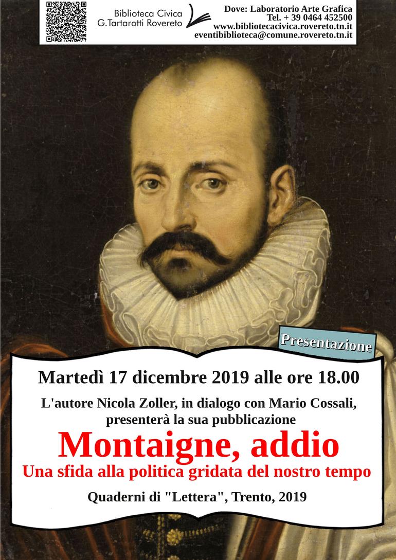 "Ho dedicato a Michel de Montaigne (1533-1592), libero pensatore francese, una raccolta di articoli pubblicati tra il 2013 e il 2018 dalla rivista “Mondoperaio”, fondata dal leader storico del socialismo italiano Pietro Nenni e diretta da Luigi Covatta. Porta come titolo “Montaigne, addio” (ed. Quaderni di “Lettera”, Trento, 2019).