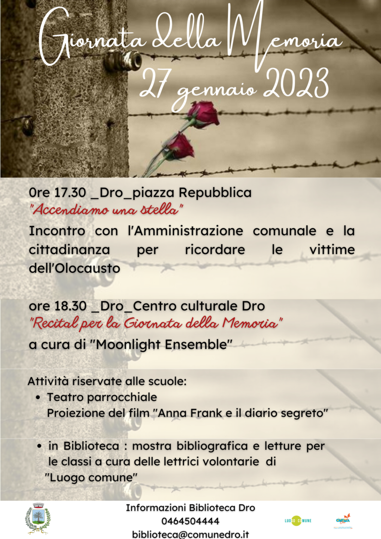 In occasione del Giorno della Memoria, l'Assessorato alla Cultura, con la Biblioteca comunale, organizzano una serie di iniziative, alcune riservate alle scuole, altre aperte a tutti.
