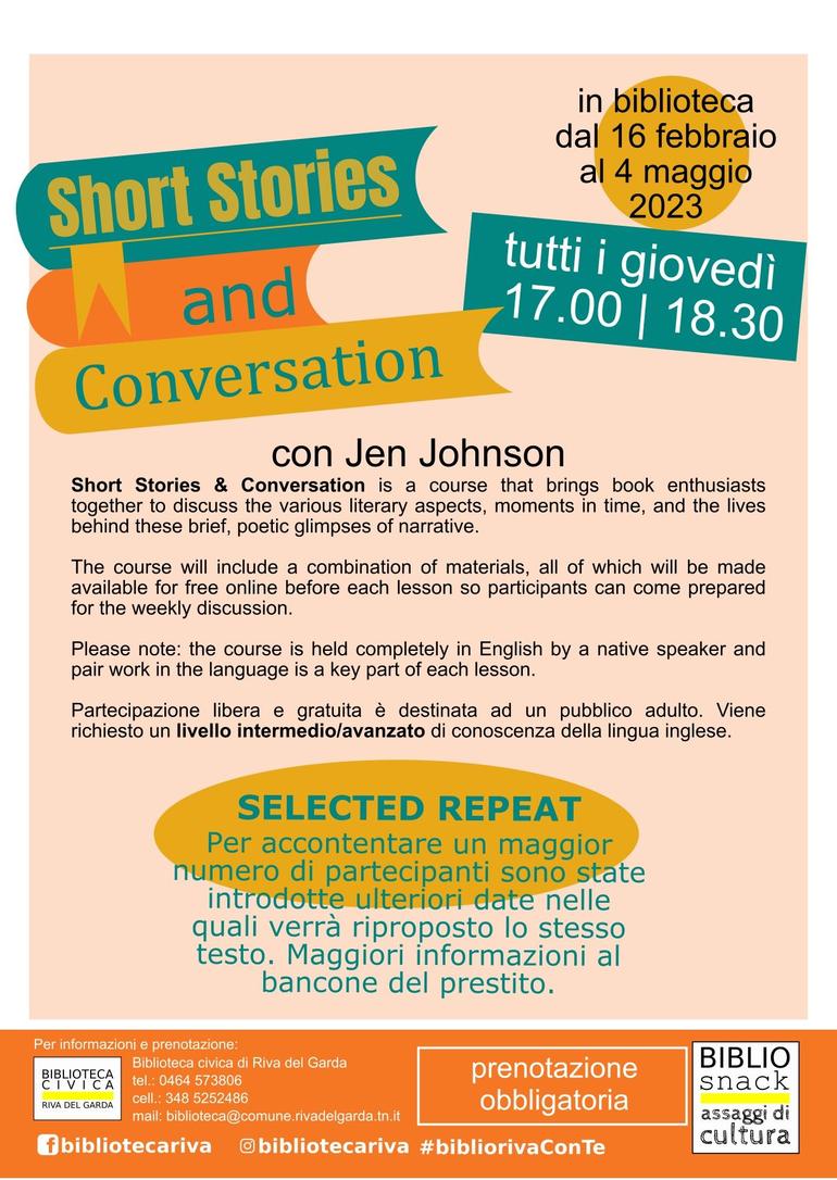 Short Stories & Conversations è un appuntamento che riunisce gli appassionati di libri. Ogni settimana viene scelto un breve testo da leggere a casa, che viene poi discusso insieme in Biblioteca. Le letture scelte possono essere piccoli racconti, poesie o altri brevi testi.