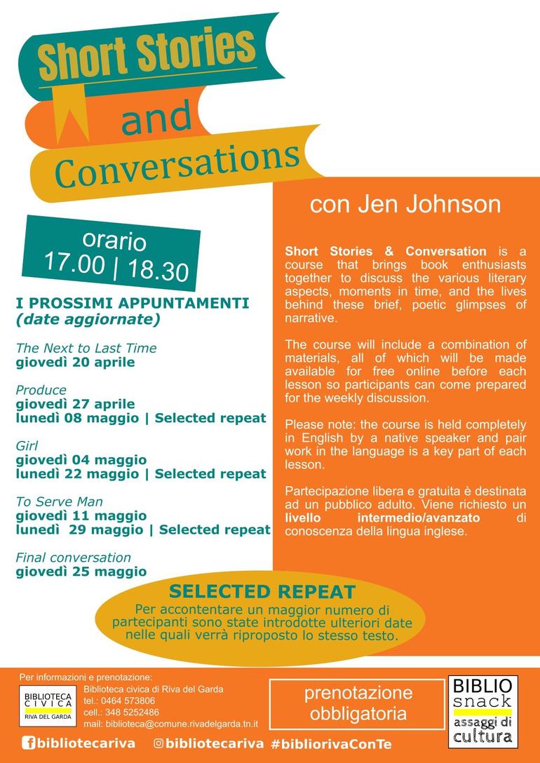 Short Stories & Conversations è un appuntamento che riunisce gli appassionati di libri. Ogni settimana viene scelto un breve testo da leggere a casa, che viene poi discusso insieme in Biblioteca. Le letture scelte possono essere piccoli racconti, poesie o altri brevi testi.