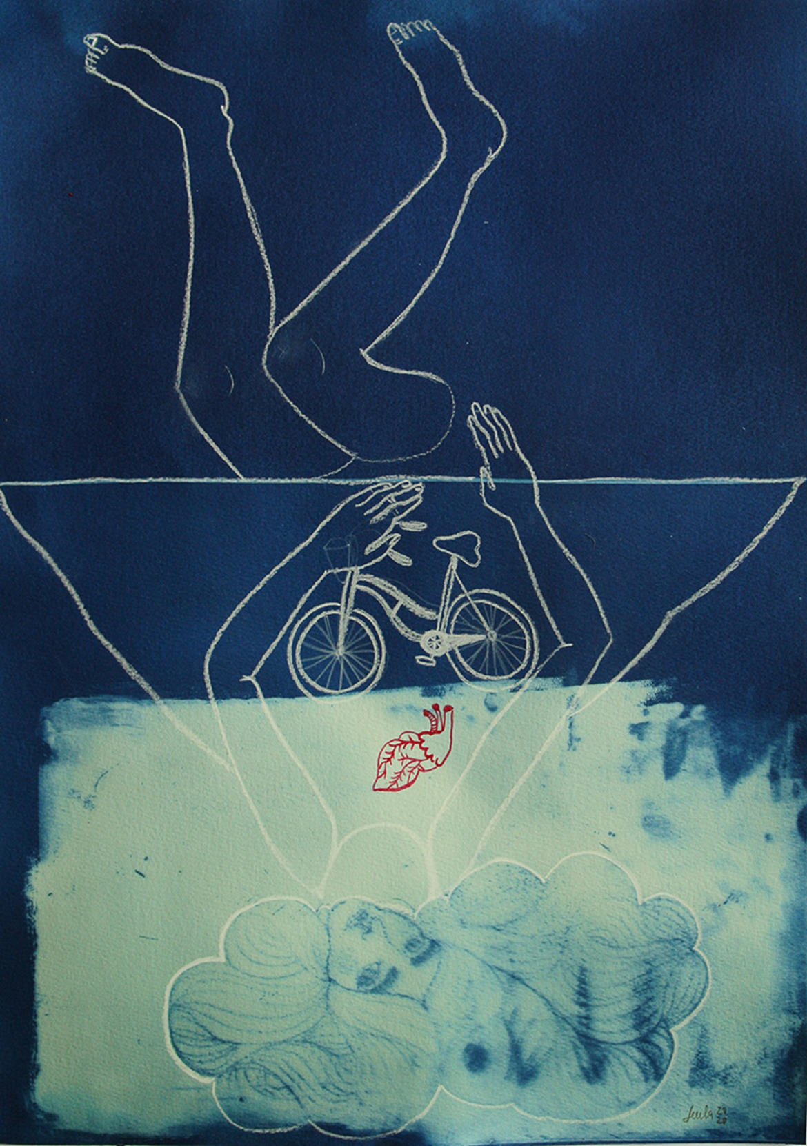 La tavola a monotipia dell’artista trentina Alessia Carli colpisce per il suo blu intenso che sfuma in un bianco lievemente sporcato d’azzurro. Uno spazio in cui perdersi, nuotare, sorvolare il mondo per muoversi liberamente in quest’atmosfera di cielo o di mare. Un blu che accoglie, avvolge ed evidenzia un cuore dalla tinta rossa accesa e una capigliatura che diventa nuvole e ariosità. Il cuore che appartiene a una figura femminile che osserva l’osservatore, in modo schietto, sincero, scevro da ogni conformismo. E un vestito, definito da semplici linee, che si apre a creare un triangolo, dove alloggiano il cuore e una bicicletta, che così posta al centro non può che trasformarsi in simbolo. E infatti, l’immagine racconta il transfert che Enrica applica alla bambola a transistor. Enrica è come congelata nel costo emotivo che si paga per restare in bilico tra aspettative - le bambine giocano con le bambole - e la rivendicazione del proprio diritto alla libertà, perché anche le femmine vogliono andare in bicicletta. Come non pensare ad un’altra figura femminile che fa risuonare ugualmente forte il concetto di provare a superare i limiti imposti dalla cultura vigente. Wadjda, la giovane protagonista del film “La bicicletta verde” (in italiano, sono “Wadjda” in originale) della regista saudita Haifan Al-Mansour offre un’immagine decisa e intraprendente. Wadjda lotta per possedere una bicicletta, mezzo tradizionalmente riservato agli uomini. La vuole verde, la sua bicicletta, per poter giocare con un bambino suo vicino di casa. La bicicletta si trasforma in un simbolo di emancipazione e libertà, al pari della “bambola transistor” di Gianni Rodari. Due differenti oggetti rappresentativi di una stessa scelta di vita, capace di trasformare Enrica e Wadjda in due persone indipendenti e desiderose di seguire le personali aspirazioni. Inoltre, ciò che unisce le diverse figure femminili citate è la loro voglia di “fare da sole”, senza adulti di riferimento, senza indicazioni o aiuti che possono indicare un percorso. La scelta di Enrica, Alison e Wadjda è una scelta individuale, condotta con autonomia e consapevolezza.