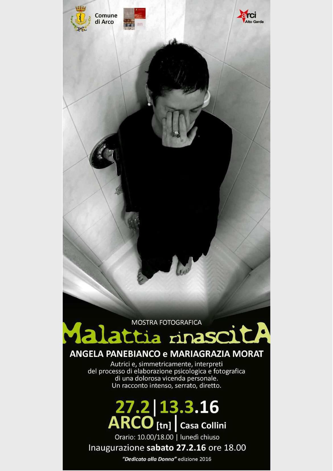 Rassegna fotografica "Dedicato alla Donna" del Comune di Arco. E' un racconto intenso, serrato e diretto, quello che ci viene proposto, in quindici immagini, da Angela Panebianco e Mariagrazia Morat. Una storia autobiografica resa possibile da una straordinaria intuizione, figlia di una vicenda dolorosa.