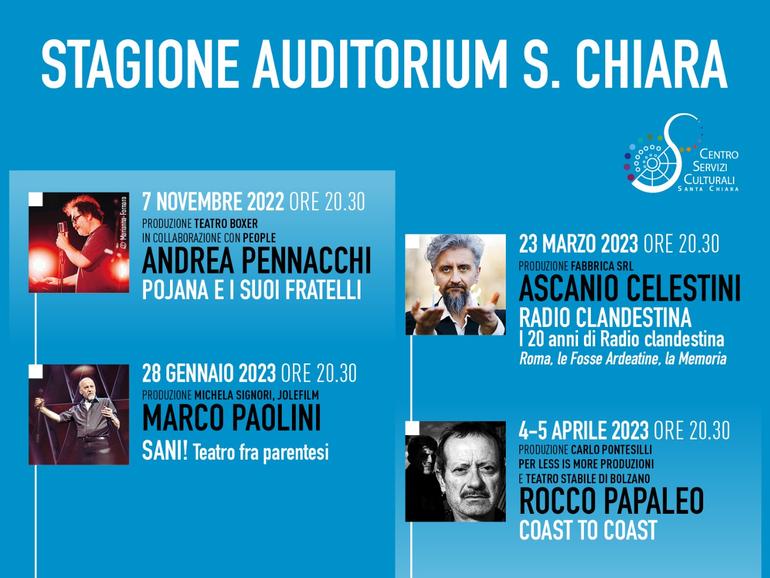 Stagione Auditorium Santa Chiara 2022 | 2023: Pennacchi, Paolini, Celestini, Papaleo