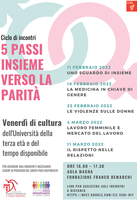 L’11 febbraio ripartiranno a Trento i “Venerdì di Cultura”, un’ulteriore proposta che va ad implementare l’offerta culturale dell’Università della terza età e del tempo disponibile (Utetd). Organizzati dalla Fondazione Franco Demarchi in collaborazione con la Commissione provinciale pari opportunità tra donna e uomo, “5 passi insieme verso la parità” è il titolo dei cinque incontri di cui si compone questo primo ciclo. A partire da uno sguardo d’insieme sulle pari opportunità, saranno affrontati temi come la medicina in chiave di genere, la violenza sulle donne, il lavoro al femminile nel mercato del lavoro e la questione del rispetto nelle relazioni.