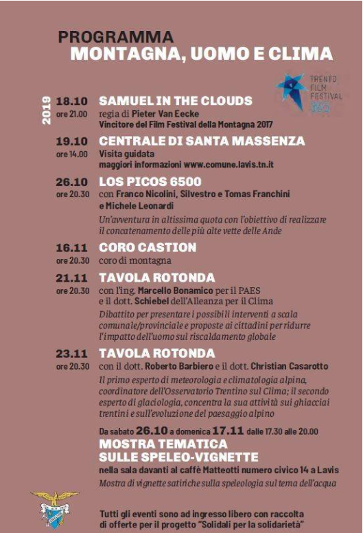 Un viaggio ricco di emozioni che affronterà un importante, attuale e dibattuto argomento: la problematica dei cambiamenti climatici e del futuro del nostro pianeta, attraverso serate, film, conferenze ma anche attraverso le esperienze e il racconto di chi, semplicemente girando il mondo e frequentando la montagna, testimonia la bellezza dell’ambiente che ci circonda ma anche la sua vulnerabilità e i cambiamenti che esso ci propone con sempre maggior intensità.